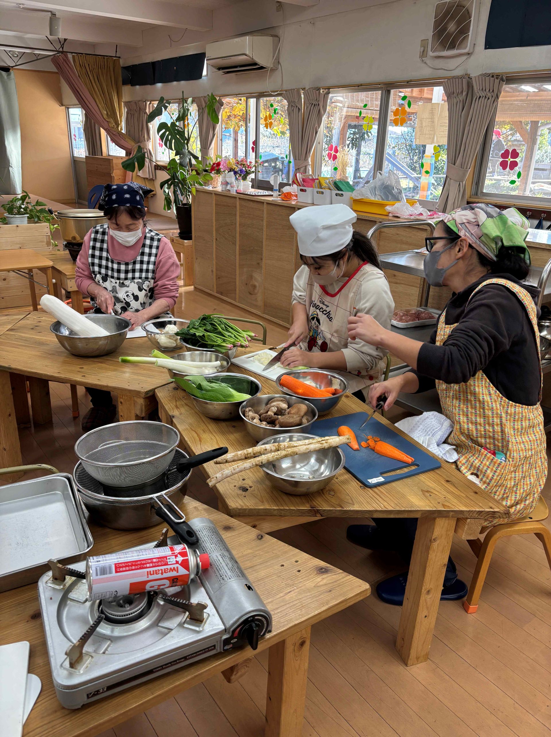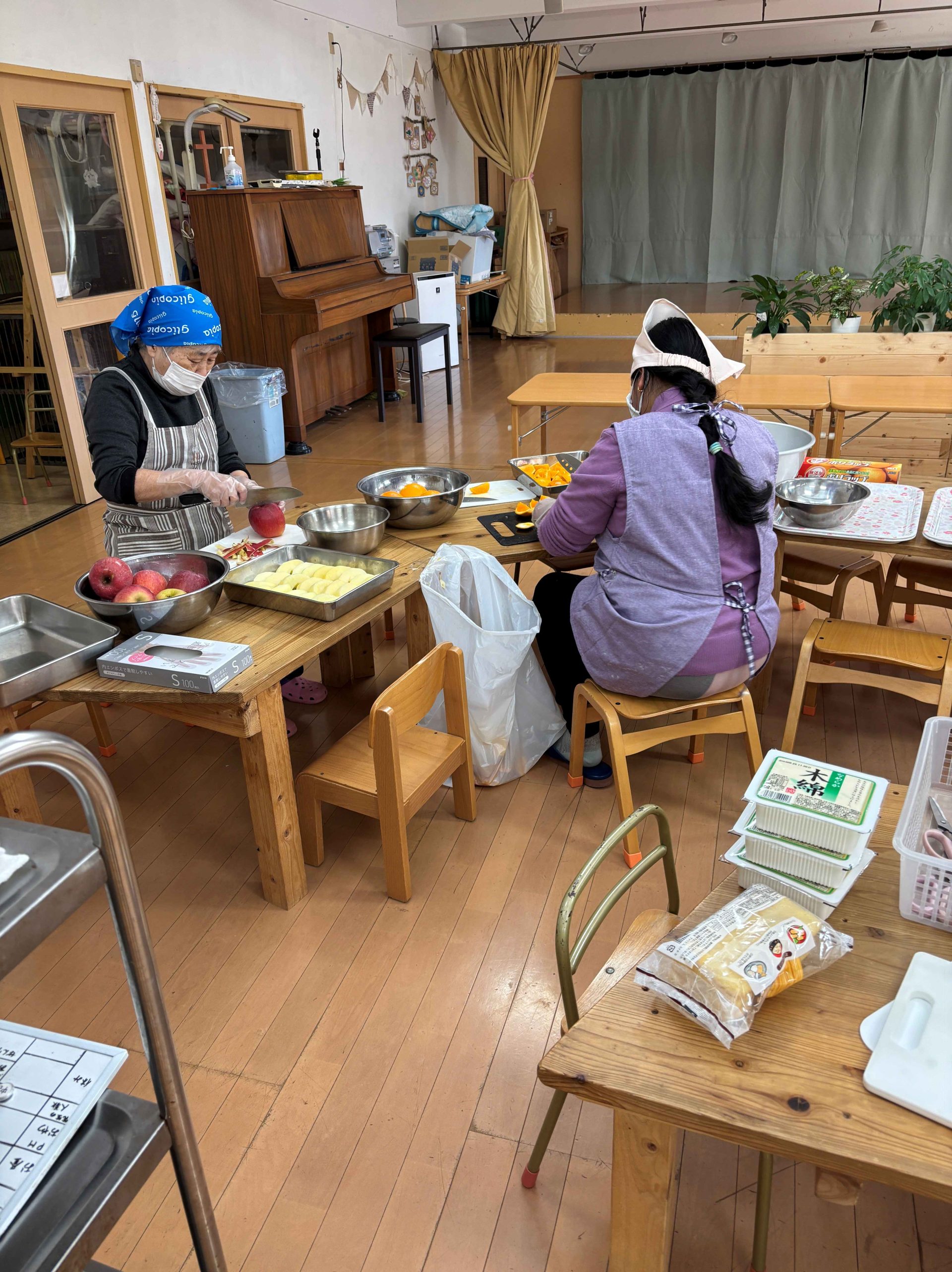 今日は、お家の方々のご協力で園にたくさんの野菜や果物が届きました。これを使って役員のお母さまがたに豚汁とおにぎりを作っていただきました。